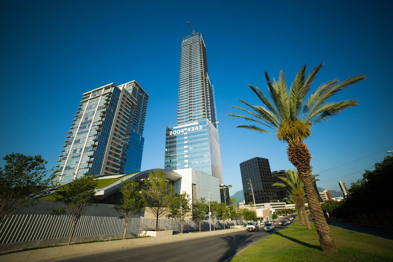KOI Tower in Monterrey, Mexico, features a facade composed primarily of double-pane insulating glass units (IGUs) fabricated with Solarban® R100 solar control low-e glass on Optiblue® tinted glass by Vitro Architectural Glass.