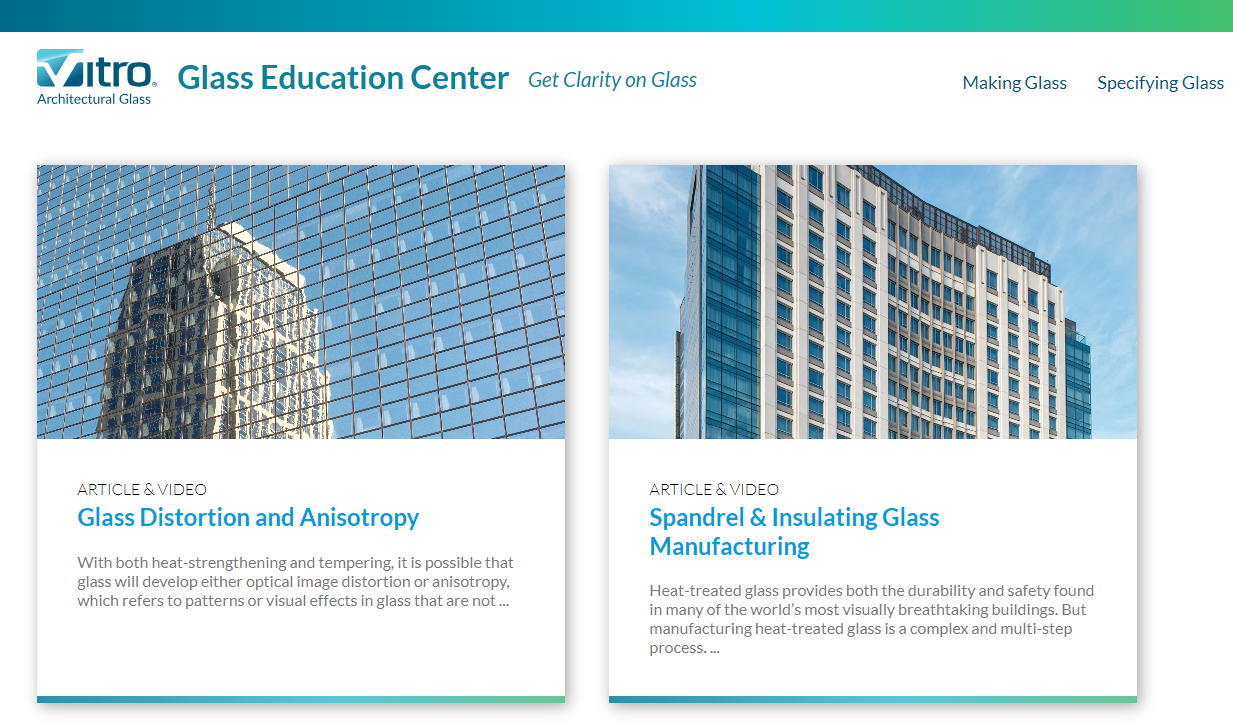 Launched in 2013, the Vitro Glass Education Center is a user-centric, continuously expanding library of technical information that uses a combination of videos, infographics, slide shows and narrative articles to examine a wide variety of glass industry topics. New topics are added regularly based on the questions most frequently asked online or to Vitro Glass sales representatives and call center personnel.