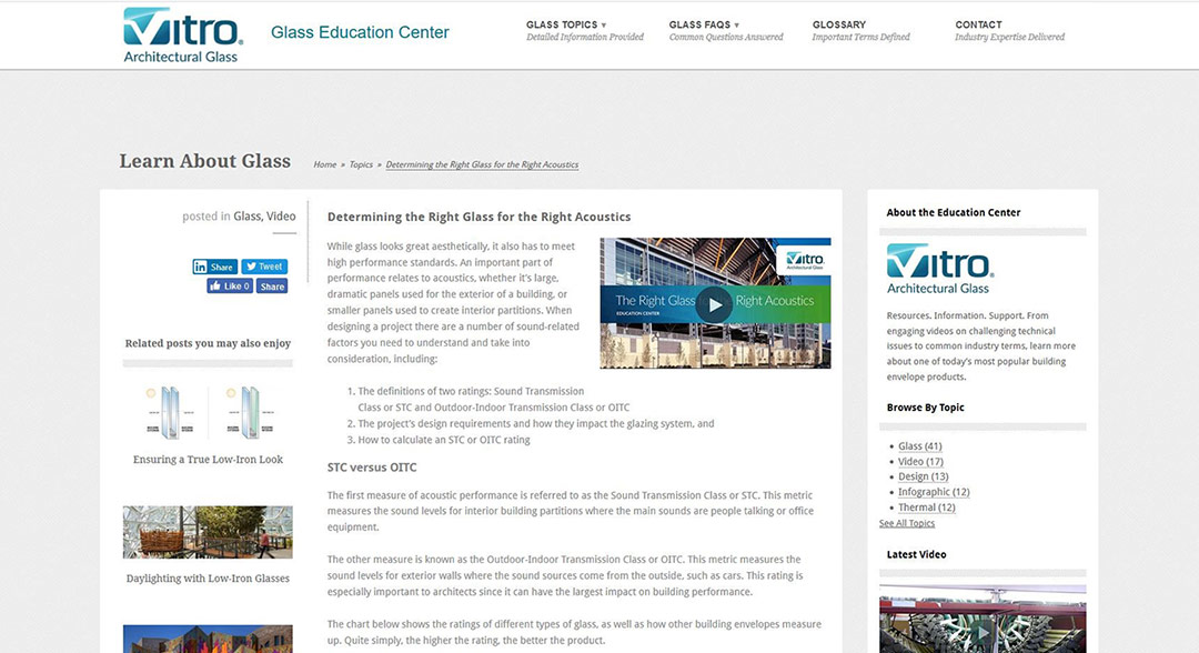 - Determining the Right Glass for the Right Acoustics – This video highlights the sound-related factors architects and specifiers must consider when assessing a project’s design requirements and how they impact the glazing system, including whether to use Sound Transmission Class (STC) or Outdoor-Indoor Transmission Class (OITC) ratings.