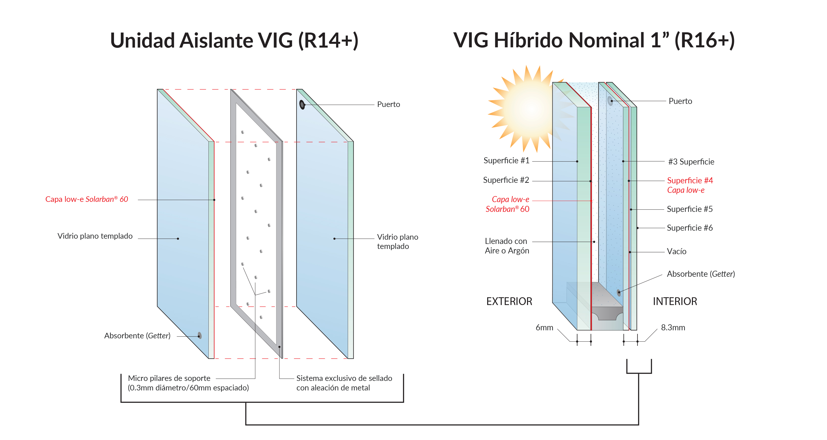 Una unidad aislante al vacío (VIG) VacuMax™ consiste en dos láminas de vidrio de entre 4 mm y 6 mm separadas por un exclusivo sello metálico libre de plomo y un espacio al vacío. La delgada construcción de la unidad y bajo peso le permiten ser incorporada virtualmente a cualquier sistema tradicional de acristalamiento, perfil (cancel) de ventana o muro cortina.
